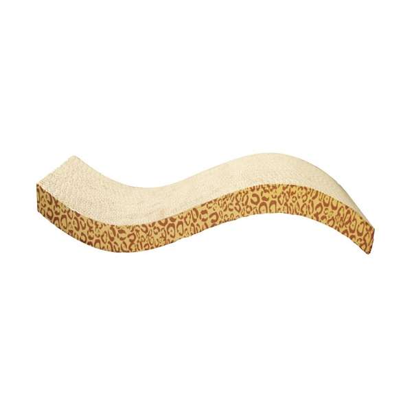 Dieses geriffelte Kratzbrett aus Pappe hat die Form einer Welle mit modernem Leopardenmuster an den Seiten.