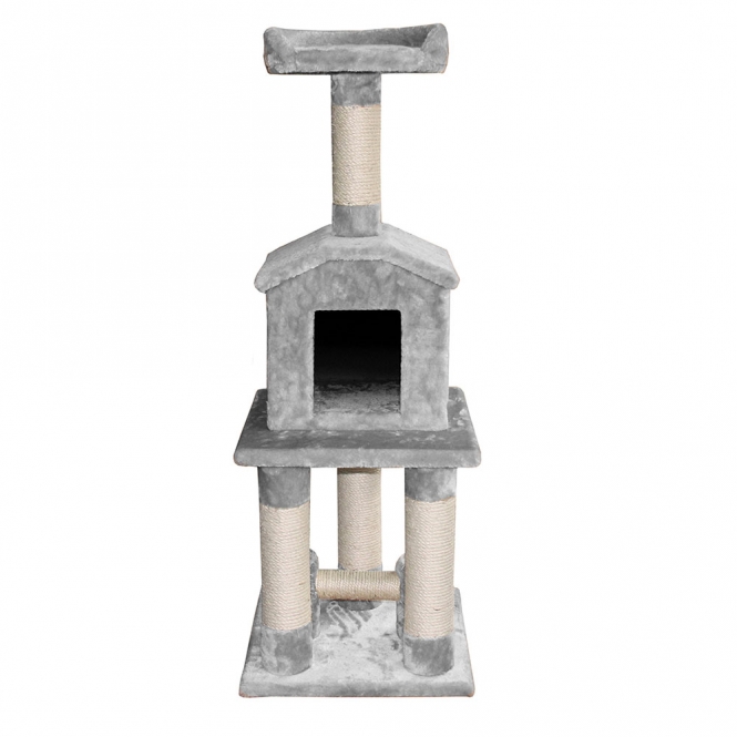 Häuschenförmiger grauer Kratzbaum mit mehreren Ebenen