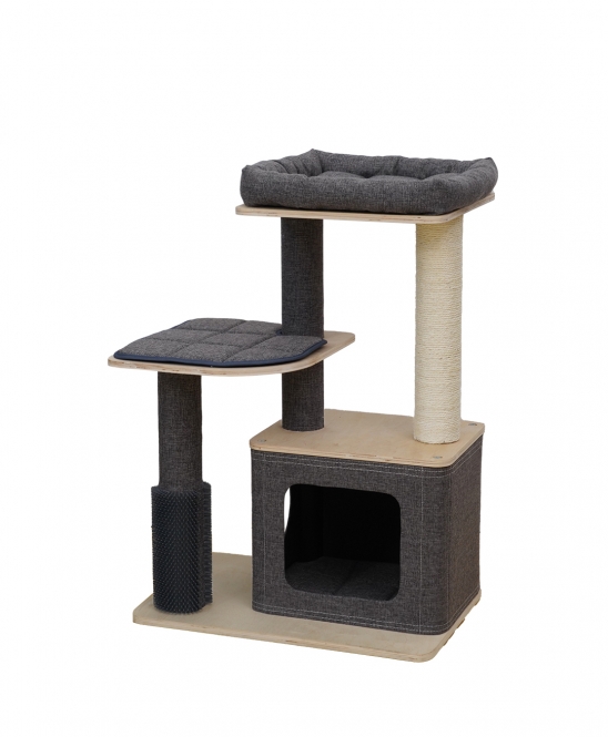 Für Katzen ist ein Kratzbaum sehr wichtig, um ihre Krallen zu pflegen und ihr Revier zu markieren. Der EBI Kratzbaum Tapei ist aus Birkensperrholz gefertigt und mit modernem dunkelgrauen Möbelstoff bezogen.