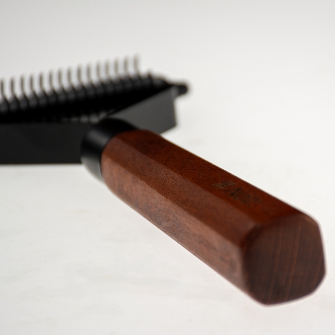 Trimmmesser von Noir Japandi aus verzinktem Edelstahl mitSchneidklingen zum schmerzlosen Entfernen von losen Haaren und Unterwolle. Die Klingen sind für zusätzliche Sicherheit abgerundet und haben einen ergonomischen Griff aus FSC-zertifizierter Buche mit dunkel gebeizter Oberfläche. Geeignet für Hunde und Katzen. Achtung! Verletzungsgefahr! Außerhalb der Reich- und Sichtweite von Kindern aufbewahren!