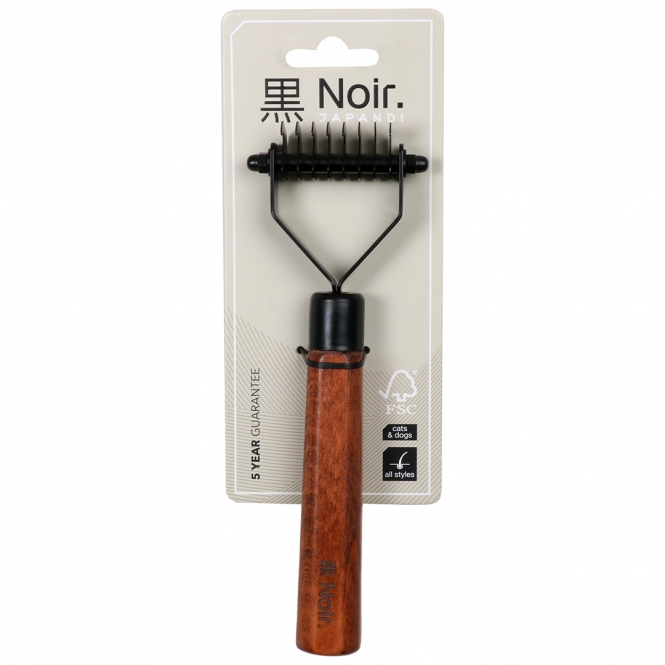 Trimmmesser von Noir Japandi aus verzinktem Edelstahl mitSchneidklingen zum schmerzlosen Entfernen von losen Haaren und Unterwolle. Die Klingen sind für zusätzliche Sicherheit abgerundet und haben einen ergonomischen Griff aus FSC-zertifizierter Buche mit dunkel gebeizter Oberfläche. Geeignet für Hunde und Katzen. Achtung! Verletzungsgefahr! Außerhalb der Reich- und Sichtweite von Kindern aufbewahren!