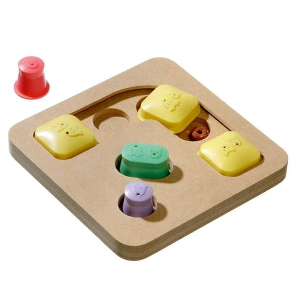 Für Fortgeschrittene! Doggy Brain Train Motion – ein Motivations- und Denkspiel für Hunde. Snacks werden in Vertiefungen gelegt, welche dann von Hütchen abgedeckt werden. Durch Schieben mit Pfote oder Schnauze oder durch Anheben der Hütchen kommt der Hund an sein Leckerlie. Dieses Spiel kann in verschiedenen Schwierigkeitsstufen gespielt werden, z. B. indem der Hund erst ein Hütchen heben und dann ein weiteres Hütchen schieben muss, um sein Leckerlie zu erhalten. Die Cups sind in verschiedenen Farben und Formen und jeweils mit Duftlöchern. Mit Anti-Rutsch-Stopper.
