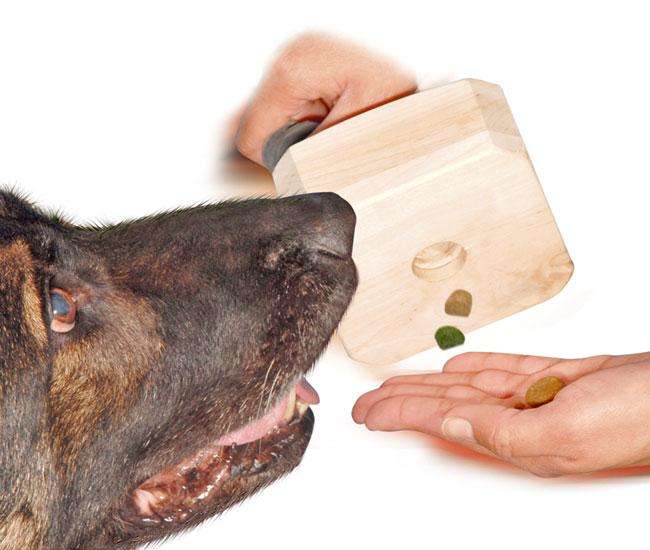 Apportieren mit Futtermotivation. Alternative für Hunde die auf Beutereize nicht gut ansprechen. Zahn- und Lefzenschutz durch neuartigen Zahnabweiser. Gebrauchsmusterschutz.