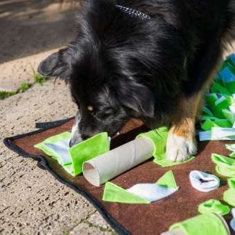Die Intelligenzschnüffelmatte ist 80 x80cm groß und besteht zur Hälfte aus einer Schnüffelwiese. Die andere Hälfte besteht aus über 20 Leckerli-Versteckmöglichkeiten in sieben verschiedenen Variationen und bietet Ihrem Vierbeiner jede Menge Beschäftigung, Herausforderung und Spaß.