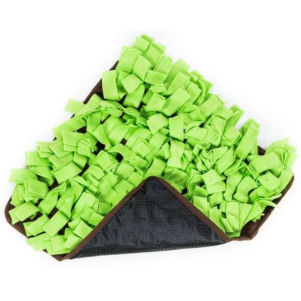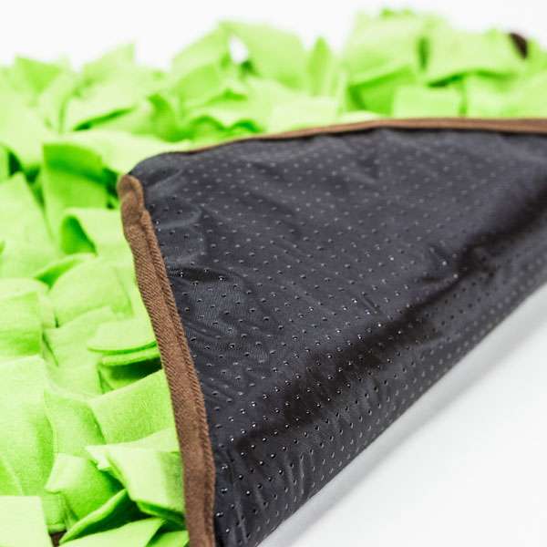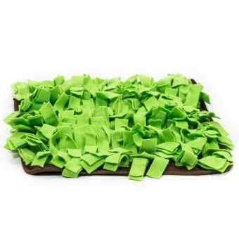 Auf der ca. 50 x 50 cm großen Matte werden Leckerlis oder auch gleich ganze Trockenfutter-Mahlzeiten zwischen den „Grashalmen“ aus Stoff versteckt, die der Hund sich mit Freude erschnüffeln wird. Die Schnüffelwiese ist mit einem Anti-Rutsch-Belag bestückt und ist waschmaschinenfest.