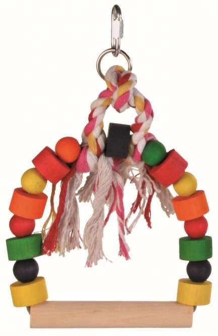 Diese Bogenschaukel bringt einen ganz besonderen Schaukelspaß für Ihren gefiederten Freund in den Käfig. Das Baumwolltau und die Holzklötzchen sind eine willkommene Abwechslung. Die Montage am Käfiggitter ist durch den Haken ganz einfach.