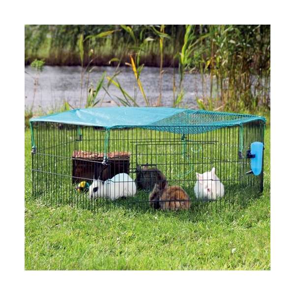 Das Gehege besteht aus pulverbeschichtetem Metall und ist mit einer Tür versehen. Ohne Probleme ist es mit einem weiteren baugleichen Gehege erweiterbar. Das mitgelieferte Schutznetz verhindert ein Hinausspringen der Tiere und bietet Schutz vor Greifvögeln, Katzen und anderen Tieren. Die Hälfte des Netztes ist als Sonnenschutz geschlossen und bietet ausreichend Schatten an sonnigen Tagen.