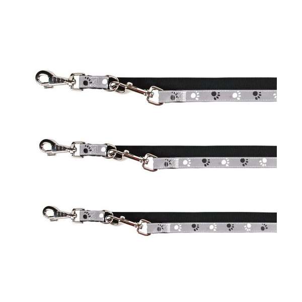 Diese Verlängerungsleine mit niedlichen Pfotenmotiven besteht aus Nylon und Kunststoff. Sie ist stark reflektierend und bringt Ihnen und Ihrem Tier so mehr Sicherheit im Straßenverkehr, gerade in den Herbst- und Wintermonaten. Die Leine mit einer Gesamtlänge von 2 m ist besonders belastbar und 3-fach verstellbar. Die Nylonunterseite ist schwarz.