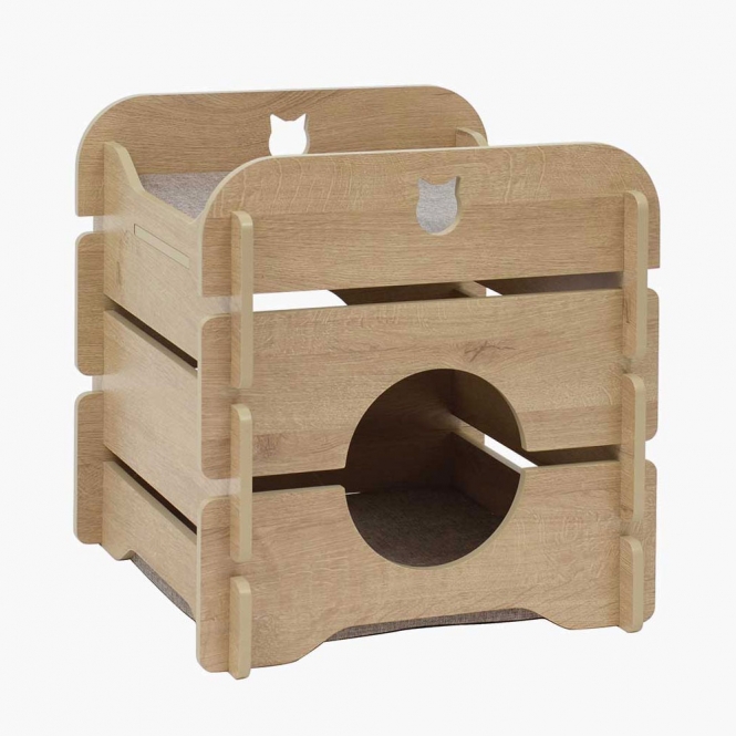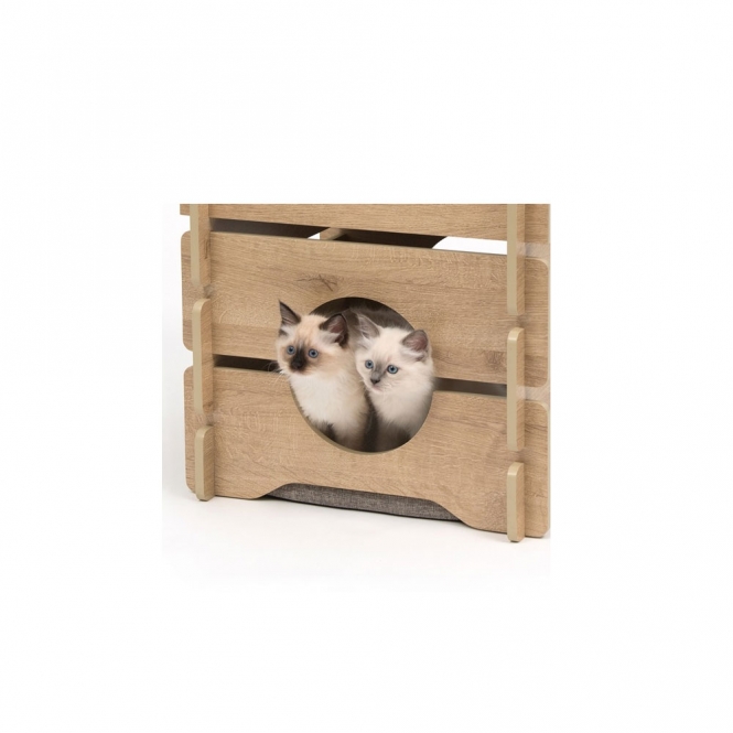 Die Vesper Katzenhöhle Cottage ist ein kubisches Möbelstück für Katzen im romantischen Landhausstil. Es besteht aus einem gemütlichen Versteck unten und einer Aussichtsplattform oben auf dem Möbelstück. Beide Etagen sind mit weichen, gepolsterten Kissen ausgestattet. Darüber hinaus verfügt das Versteck über zwei Eingänge, damit sich Ihre Katze nicht eingeengt fühlt.